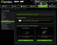 Minimum: OS: Windows XP (32-Bit only), Vista, 7, or 8 Processor: Dual Core CPU (2.2+ GHz Dual Core CPU or better) Memory: 2GB Hard Disk Space: Video Card: DirectX 9, Shader Model 3 compliant graphics cards (GeForce 8800 GT 512 MB, GeForce GTS 250, etc) DirectX®: 9.0c Additional: Metro: Last Light utilizes NVIDIA 3D Vision with compatible cards and hardware. Recommended: OS: Windows 7 or 8 Processor: Any Quad Core or 3.0+ GHz Dual Core CPU Memory: 2GB Hard Disk Space: Video Card: DirectX 11 compliant graphics card (GeForce GTX 480 and above) DirectX®: 11 Additional: Metro: Last Light utilizes NVIDIA 3D Vision with compatible cards and hardware. Сообщение отредактировал EnTaGgg - 17.04.2013, 20:30 -------------------- |