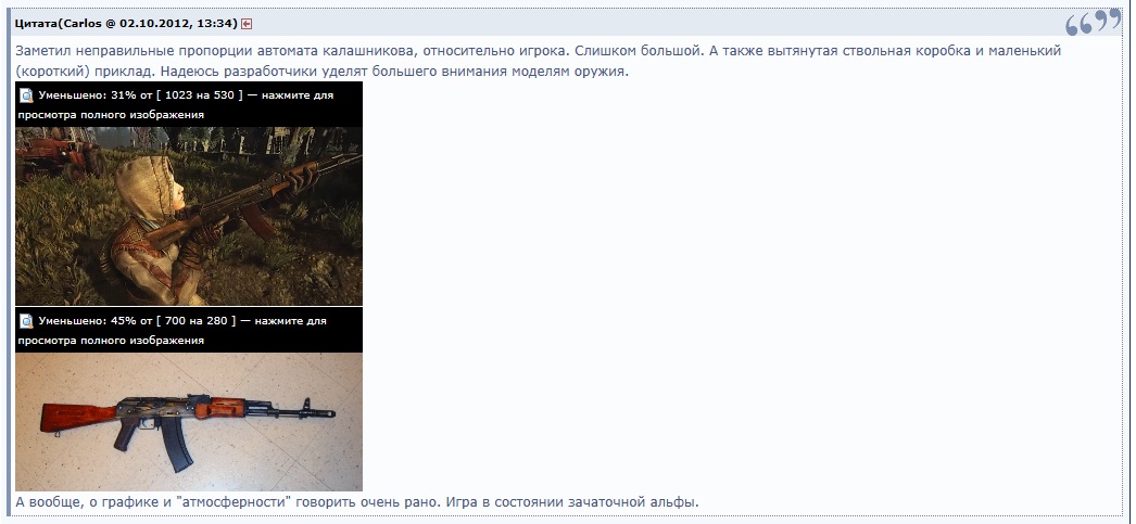 Заметил неправильные пропорции автомата калашникова, относительно игрока. Слишком большой. А также вытянутая ствольная коробка и маленький (короткий) приклад. Надеюсь разработчики уделят большего внимания моделям оружия. А вообще, о графике и "атмосферности" говорить очень рано. Игра в состоянии зачаточной альфы.